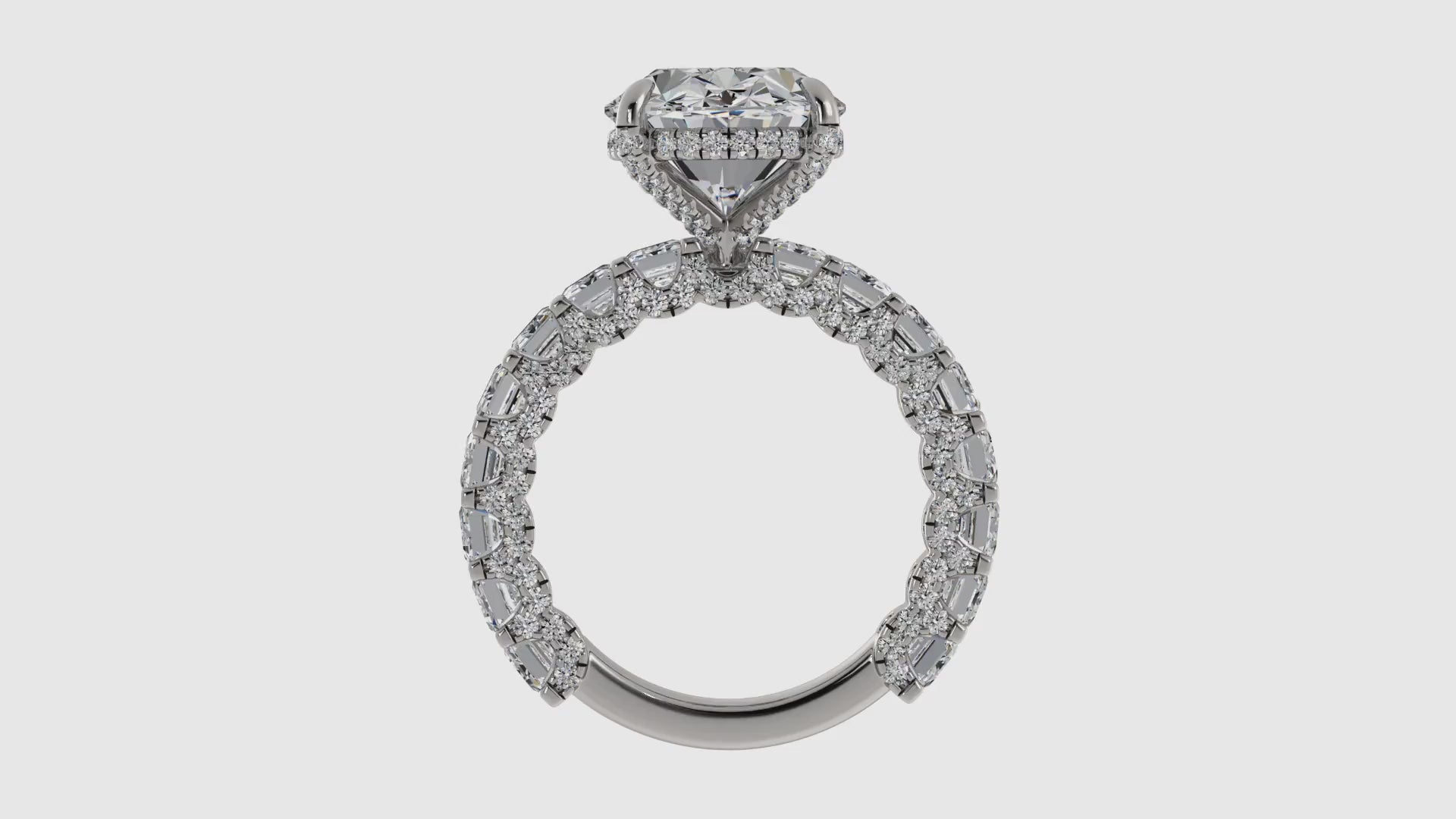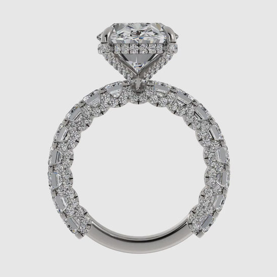 Part of the Founders Collection, The Seraphina Ring features a center stone shape of your choice, 4.00 carats or larger, in a pavé-accented setting to highlight the stone. Emerald-cut diamonds line the band three-quarters of the way down, and a hidden halo beneath the center adds extra brilliance. Detailed from prongs to head, this ring offers a bold and elegant design. This ring can be made to order in your choice of 18K Yellow Gold, 18K Rose Gold or Platinum.